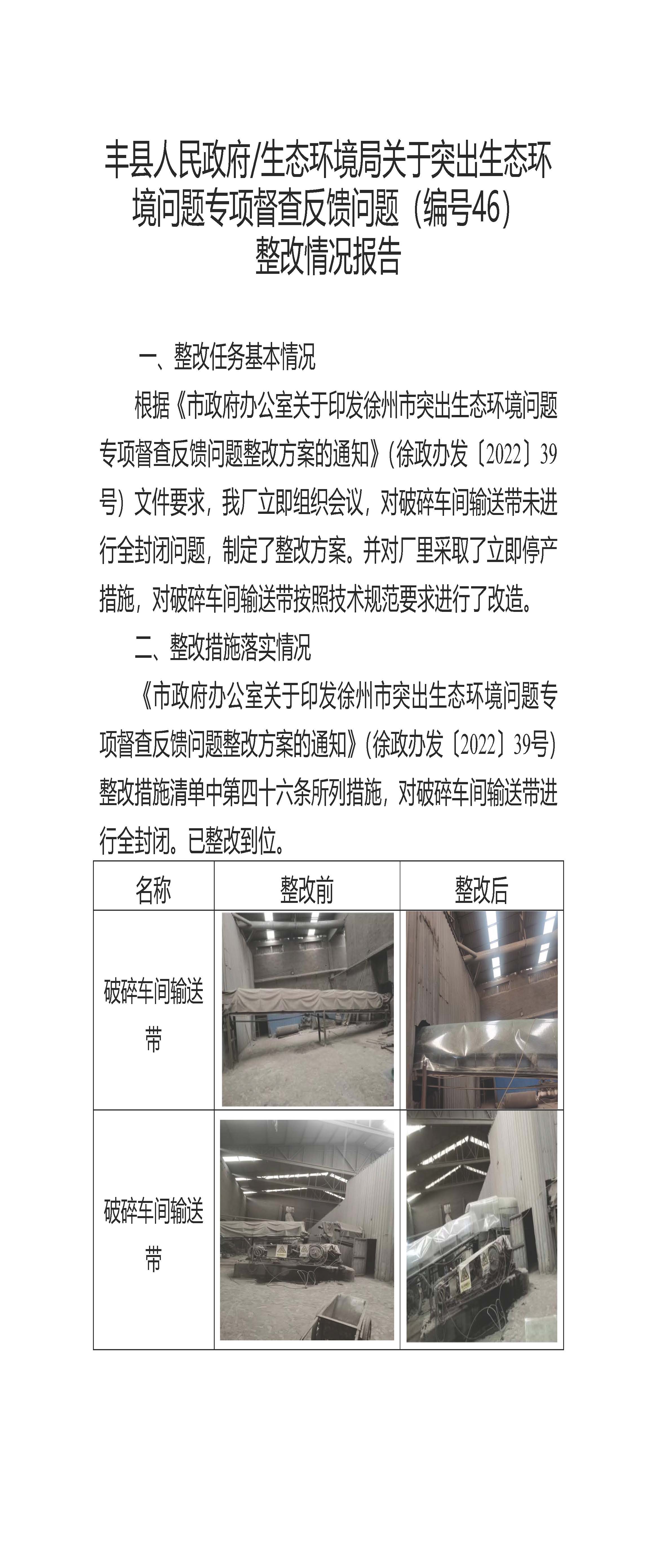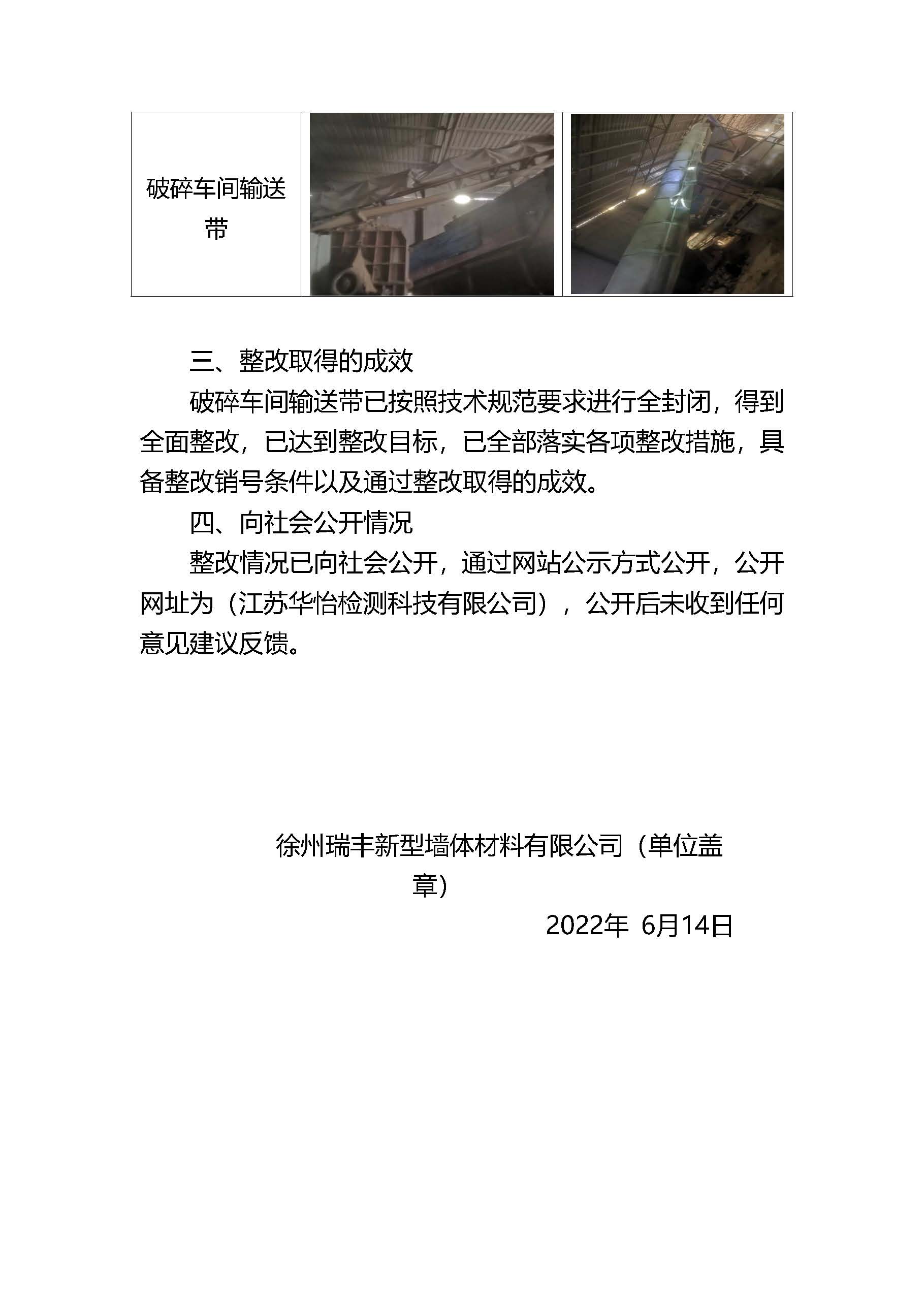 按照《市政府办公室关于印发徐州市突出生态环境问题专项督查反馈问题整改方案的通知》要求,我徐州瑞丰新型墙体材料有限公司于2022年6月2日,完成了突出生态环境问题专项督查反馈问题(编号*46)的整改工作,现将整改结果在江苏华怡